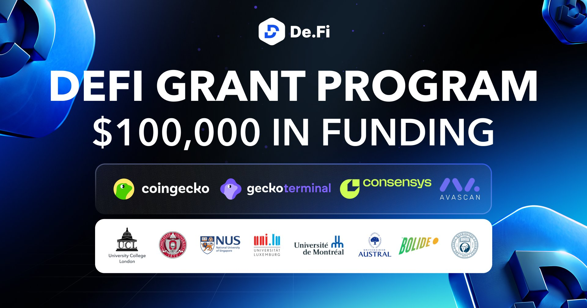A few days ago, we launched the De.Fi Grant Program with a total pool of $100,000 to support developers building dApps powered by the De.Fi API – a technology already trusted by CoinGecko, Avascan, and leading universities worldwide.