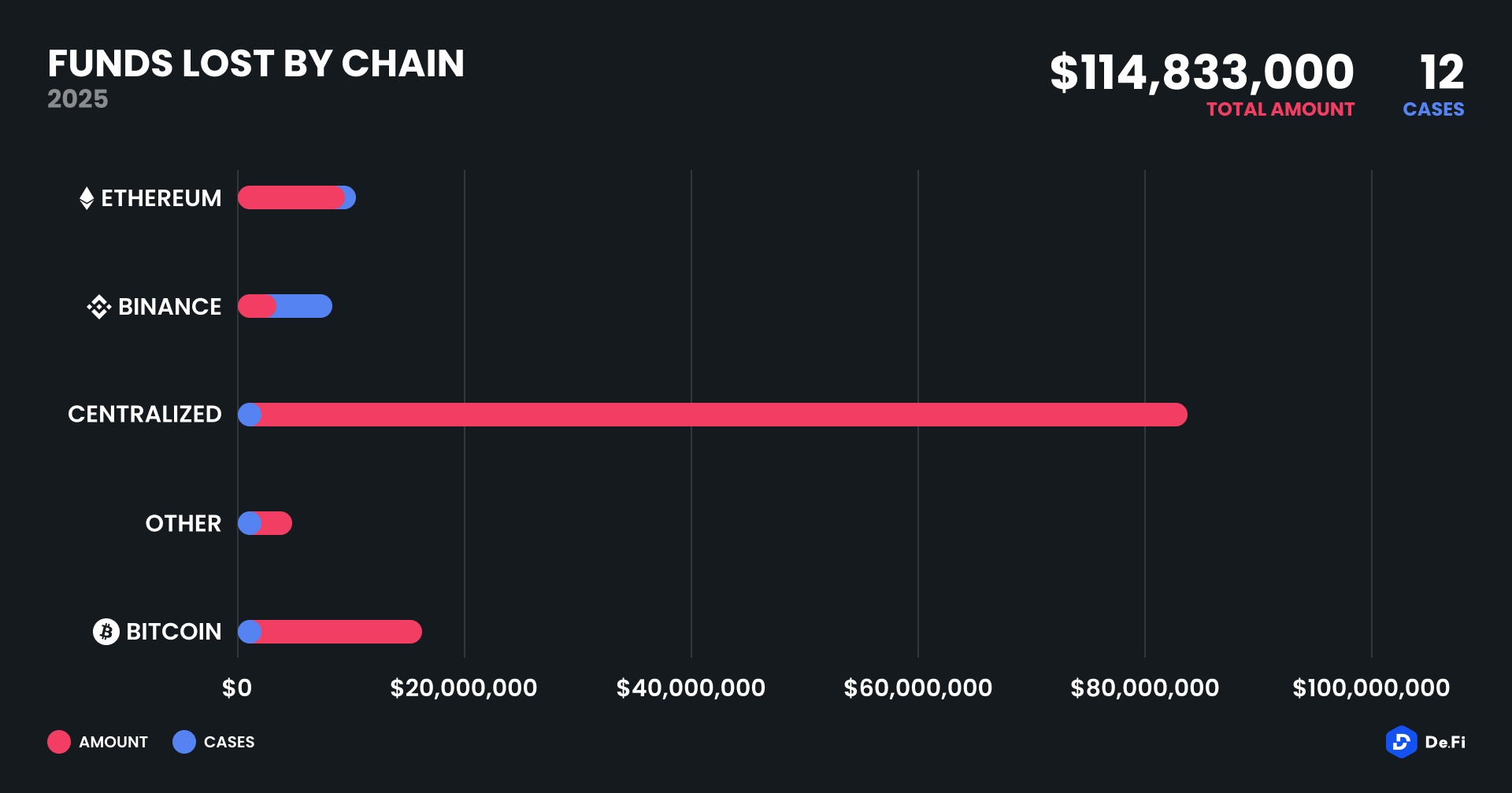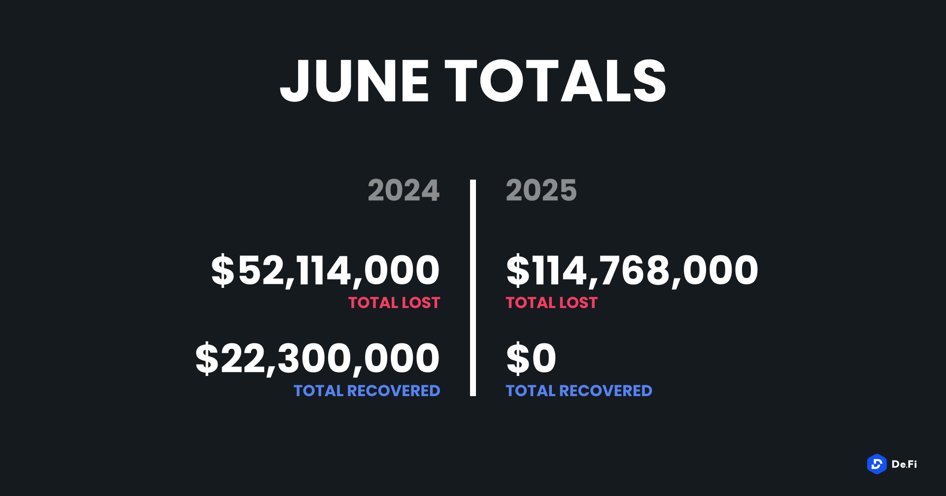 June 2025 witnessed another alarming month for Web3 security, with a total of $114,768,000 lost during 11 separate attacks. This figure doubled the loss in June 2024 ($52.1 million), indicating an existing vulnerability in both centralized and decentralized networks. No funds were recovered in the month, reflecting lackluster failure to remediate even as exploit complexity continues to increase.