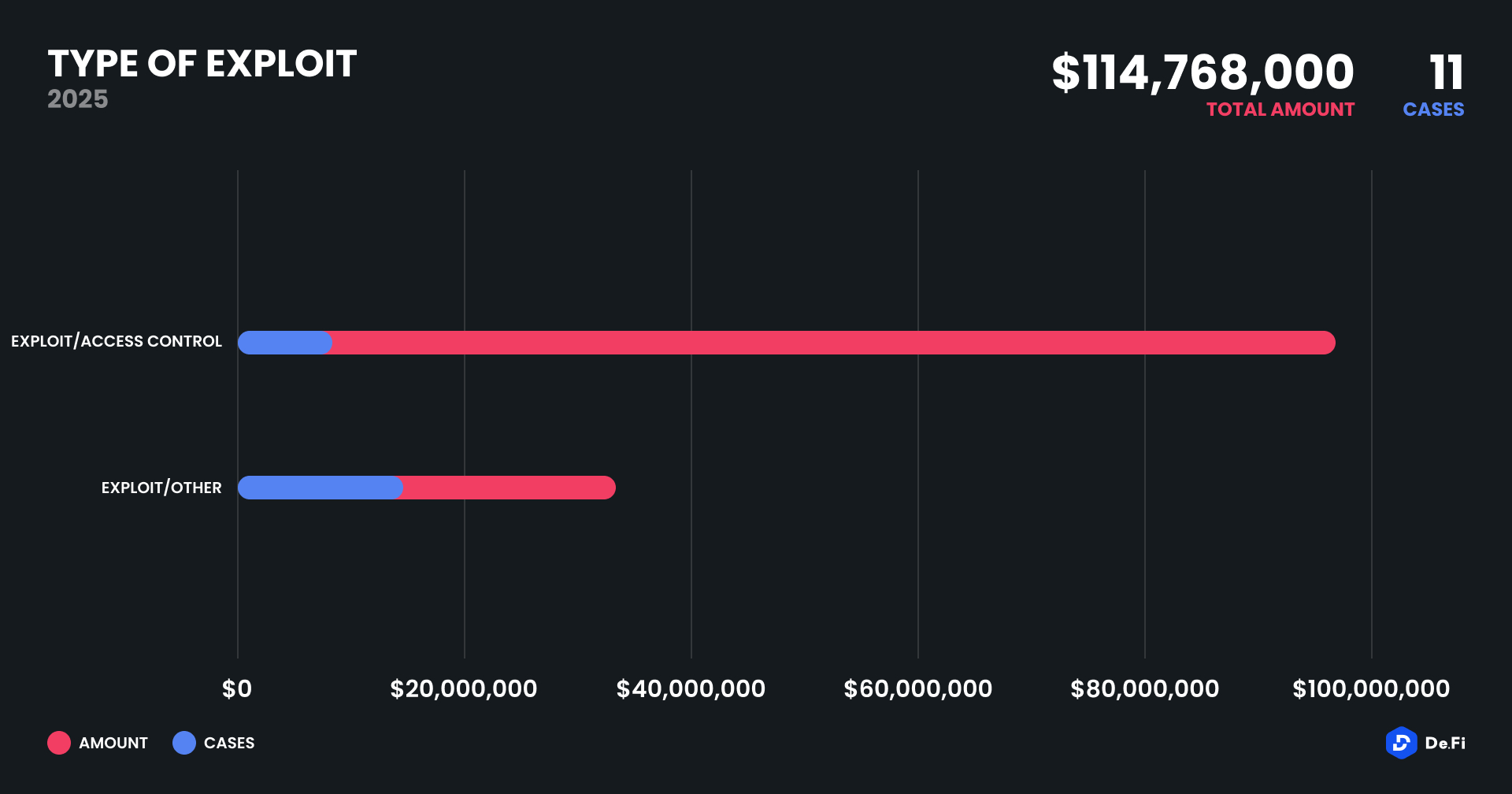 Overall, the mix of access control and smart contract logic vulnerabilities resulted in 11 instances of exploits. This was largely a repeat of a trend seen throughout 2025—where both small-cap projects and large centralized actors are more than ever vulnerable to very simple but devastating attacks.