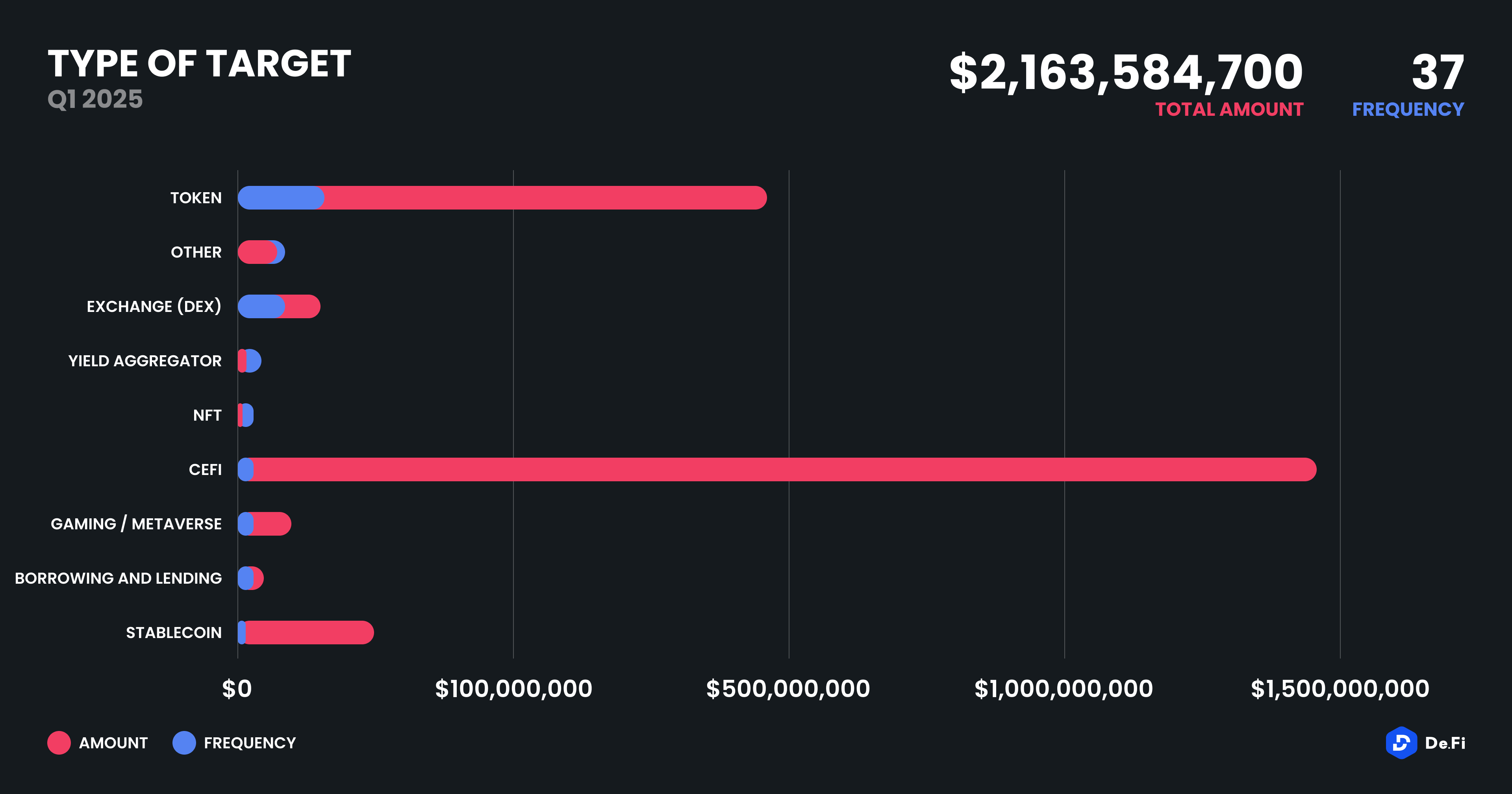 The CeFi category took the majority of the losses in Q1 2025, thanks to two gigantic events: the Bybit breach, which resulted in $1.4 billion lost, and the Phemex exploit, which added another $37 million. Together, these centralized failures accounted for over 70% of money lost for the quarter. Both accidents highlight the risks of centralised custody designs, particularly when security is dependent on internal access controls and closed-source systems that lack the transparency and composability of decentralised protocols.